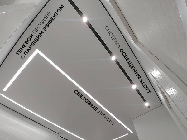 Помимо того, что вы выбираете цвет и фактуру материала, вы решаете, по какой технологии он будет установлен. В разделе «Каталог» есть примеры парящих потолков, витражных, с нишевыми световыми линиями и спотами.